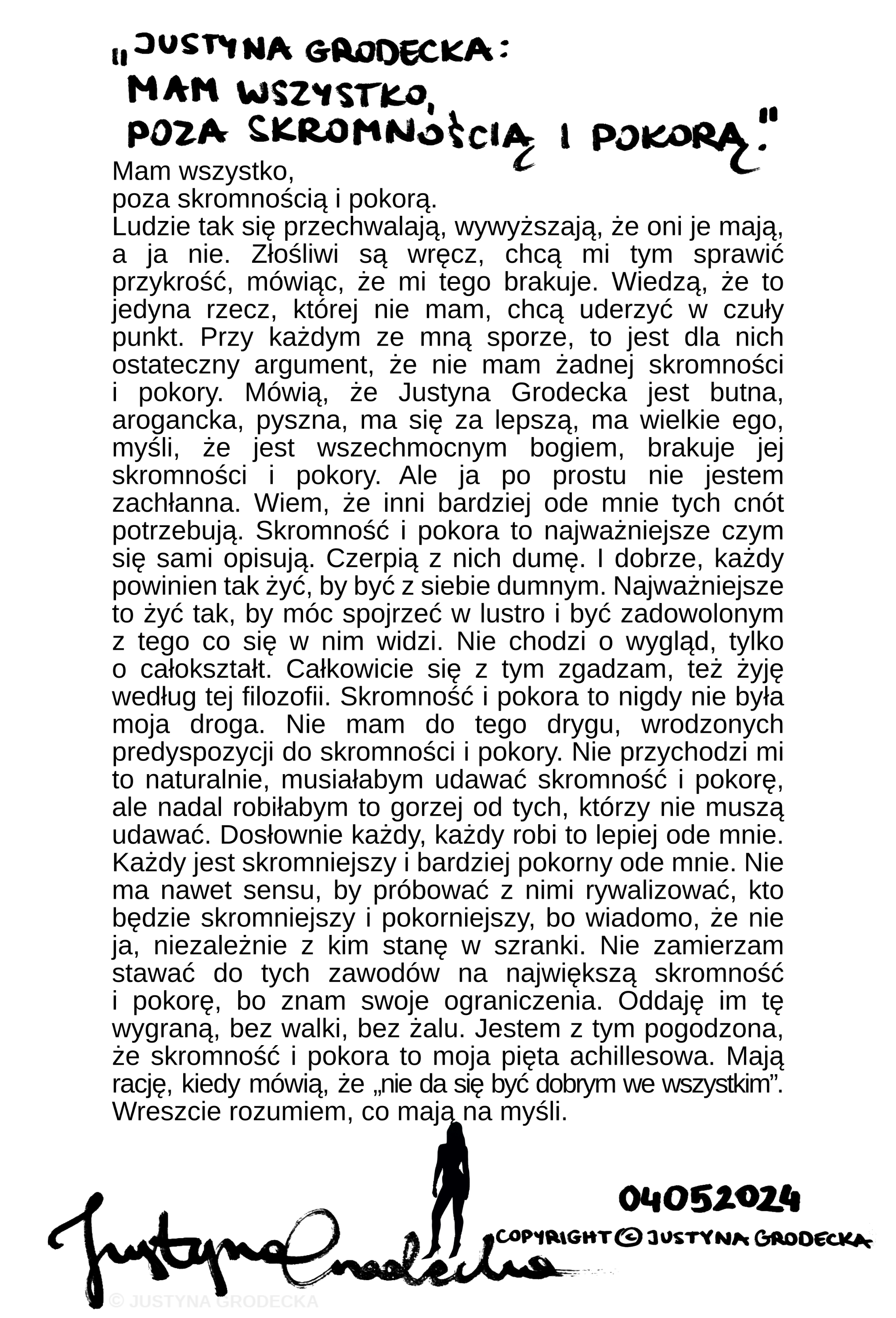 "JUSTYNA GRODECKA: MAM WSZYSTKO, POZA SKROMNOŚCIĄ I POKORĄ"