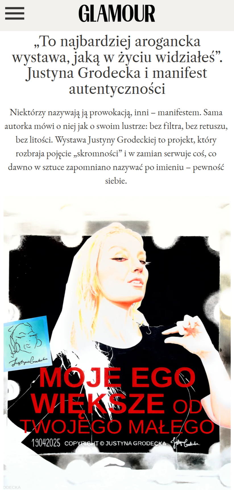 GLAMOUR POLAND "'To najbardziej arogancka wystawa, jaką w życiu widziałeś'. Justyna Grodecka i manifest autentyczności". ("'This is the most arrogant exhibition you have ever seen.' Justyna Grodecka and the manifesto of authenticity") Read the article at/Dostęp do artykułu pod linkiem: www.glamour.pl/lifestyle/to-najbardziej-arogancka-wystawa-jaka-w-zyciu-widziales-justyna-grodecka-i-manifest-autentycznosci