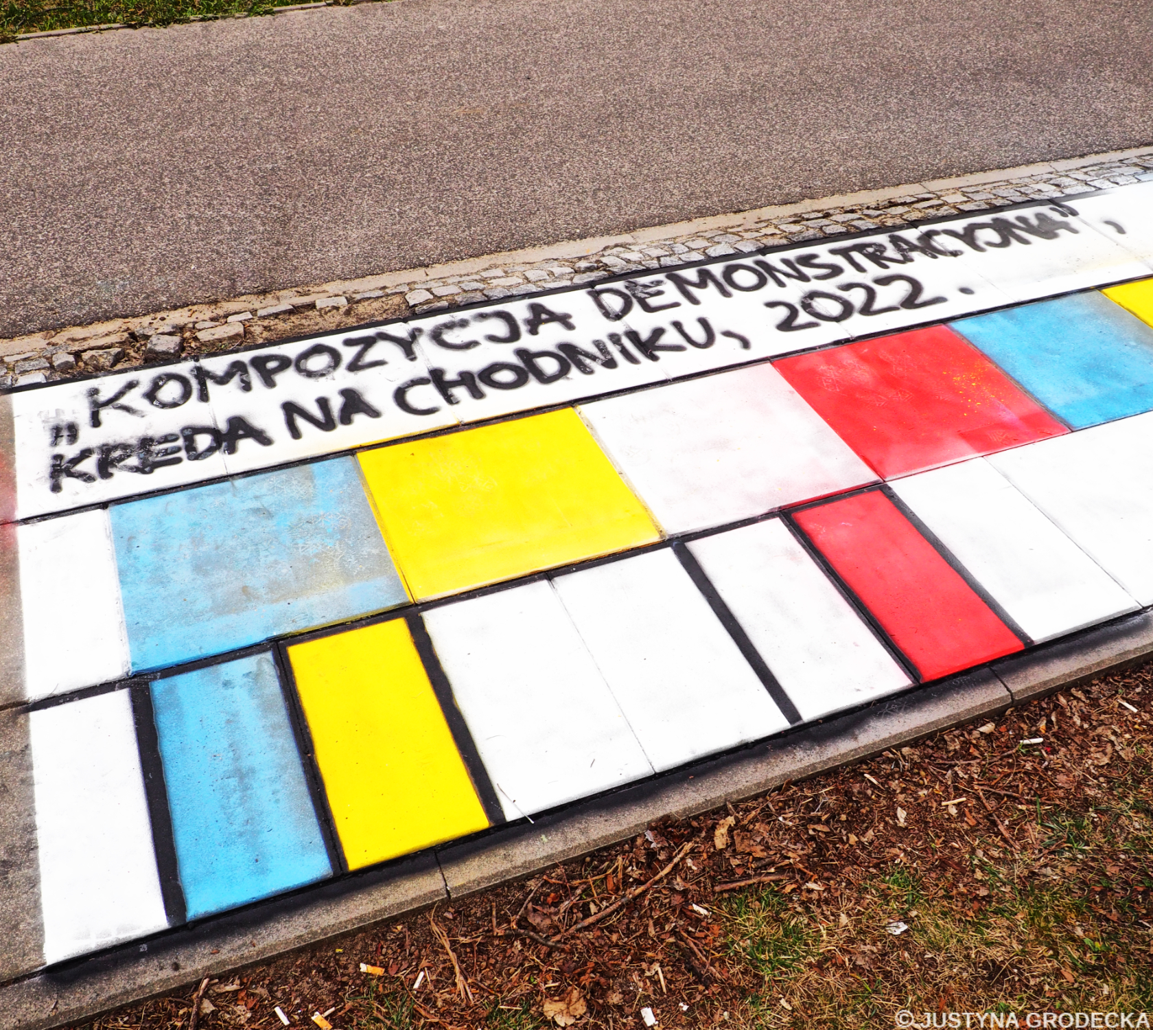 sztuka w przestrzeni publicznej   : kreda na chodniku - 'Galeria Wolna Ukraina',  2022.04 150 x 500 cm;   59.1 x 196.9" praca ukończona