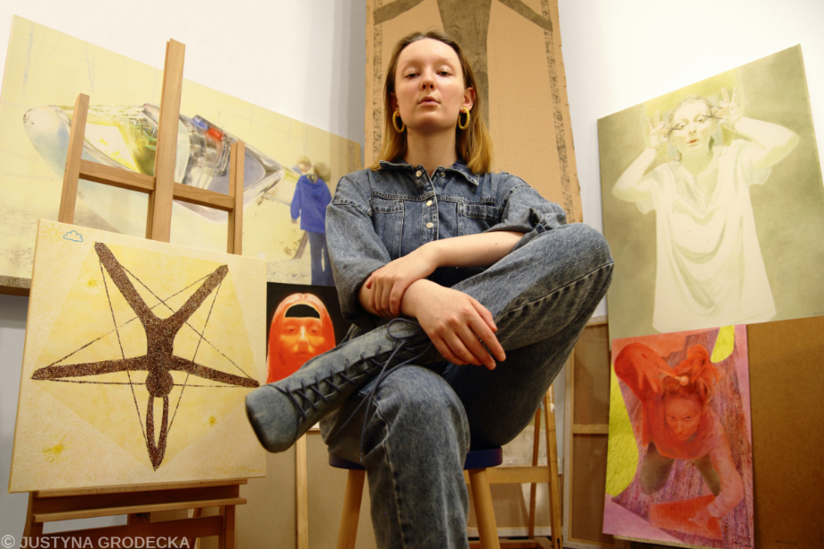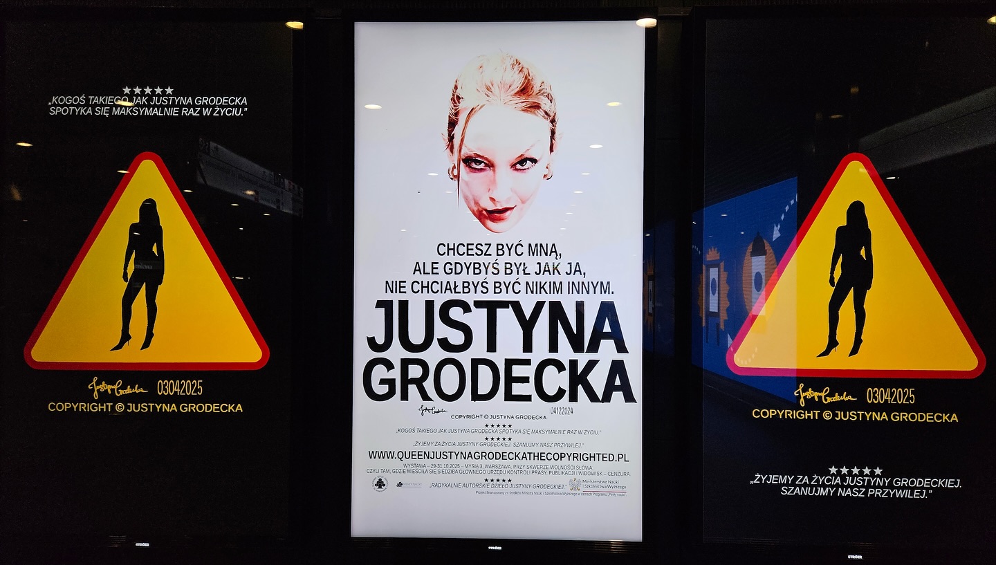 Justyna Grodecka - ur. 1998 w Warszawie. Wszechstronna i wielokrotnie nagradzana artystka multidyscyplinarna, producent, kierownik projektów i organizator głośnych przedsięwzięć i wydarzeń kulturalnych. 2-krotna laureatka "Stypendium Ministra Kultury i Dziedzictwa Narodowego za wybitne osiągnięcia". Otrzymała Grant "Perły Nauki" Ministra Edukacji i Nauki na jej projekt "Copyright (c) Artysta - temat prawa autorskiego wchodzi do głównego nurtu sztuki". Laureatka Stypendium przyznawanego przez Marszałka Województwa Mazowieckiego. 4-krotna laureatka "Stypendium Rektora dla najlepszych studentów ASP w Warszawie". Laureatka Stypendium Erasmus+. Studia na Wydziale Grafiki na Akademii Sztuk Pięknych w Warszawie (Magister Sztuki z oceną celującą) i wydziale Freie Kunst na Akademie der Bildenden Künste München, Monachium. Praca magisterska pt. "Copyright (C) Justyna Grodecka" otrzymała najwyższą ocenę pomimo bycia postrzeganą jako kontrowersyjny manifest artystyczny Justyny Grodeckiej; praca wzbudziła skrajne emocje i w trybie ekspresowym zyskała rozgłos w kraju. Laureatka wielu nagród, m.in. prestiżowej nagrody KTR 2021 za obrazy olejne w kampanii o międzynarodowym zasięgu medialnym "Obraz pokolenia Z" Zalando, w której Grodecka wystąpiła jako ona sama; nagrody Generali; nagrody Danfoss; nagrody BWA Ostrowiec; nagrody BWA Rzeszów. Swoje prace prezentowała na wielkoformatowych muralach, plakatach, banerach, ekranach, chodnikach w przestrzeni miejskiej w całej Polsce, w tym w metrze warszawskim i na licznych wystawach sztuki solowych i zbiorowych w kraju i na świecie. Organizowała wystawy i wydarzenia artystyczne popularyzujące kulturę. Brała udział w akcjach performatywnych i artystycznych zaangażowanych w tematykę społeczną, tj. dążenie do pokoju, problemy mniejszości społecznych, prawo autorskie twórców. Tworzyła animacje/video, które były prezentowane w Internecie i telewizji, w tym na kanale TVP Kultura. Film "Obraz Pokolenia Z", w którym Justyna Grodecka wystąpiła u boku swoich dzieł powstałych w latach 2016-2021 był emitowany w telewizji, Internecie i przestrzeni miejskiej w całym kraju, w tym przy PKiN w Warszawie. Występowała w filmach, spotach i teledyskach jako ona sama (np. M.st. Warszawy, teledysku Rubika, spocie Województwa Mazowieckiego). Wielokrotnie występowała, eksponowała swoje prace i opowiadała o twórczości w radiu, podcastach, prasie i telewizji, m.in. TVN24, TVN, TVP Kultura, TVP Warszawa, Polsat, Lokalna TV, Newonce Radio, Radio RMF, Radio Zet, Radio Eska, Radio Kampus, Glamour, Vogue, Wysokie Obcasy, Wyborcza, Newsweek, Noizz, Zwierciadło, Contemporary Lynx Magazine, Label Magazine, Onet Kultura, Elle, Wirtualna Polska, KMag, Aktivist, CzasNaWnętrze magazyn, Wirtualne media, FashionPost magazyn, WhiteMad, Aspiracje, ReasonWhy, Legalna Kultura i wiele innych krajowych i zagranicznych.